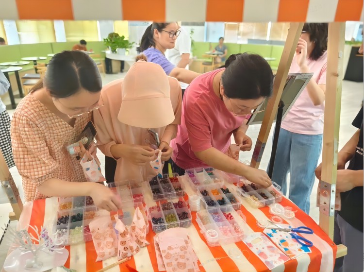 彩珠斑斕,猶如繁星點(diǎn)點(diǎn),在場的海陵員工精心挑選了自己心儀的珠子,以靈巧的雙手,將這些絢爛的彩珠編織成一條條獨(dú)一無二的手鏈。