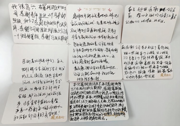 現(xiàn)場每一位家長都手寫了對暑托班的感謝信。有的家長情感細(xì)膩,賦詩一首,用優(yōu)美的詩句表達(dá)了對暑托班深深的感激之情;有的家長則先打好了草稿,再滿滿當(dāng)當(dāng)?shù)刂`寫到卡片上,每一個(gè)字都凝聚著對暑托班老師及工作人員的敬意與感謝。這些感謝信,如同一幅幅溫馨的畫面,展現(xiàn)了家長與暑托班之間深厚的情感紐帶。