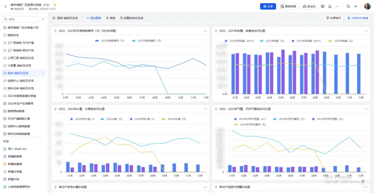 最終完成的儀表盤,改變了廠區(qū)能耗數(shù)據(jù)收集困難、分析困難、及時性低的問題。通過儀表盤這一新工具將原本獨立的數(shù)據(jù)整合起來,橫可看每月數(shù)據(jù)變化,縱可查往年同比增長,小可看單體設(shè)備耗能,大可覽全廠能耗起伏。在海陵實現(xiàn)能源精細化管理、節(jié)能減排和成本控制目標的道路上給予了幫助。項鈺茹還帶著這個儀表盤參與了9月20日的海陵飛書案例大賽,取得了二等獎的好成績。