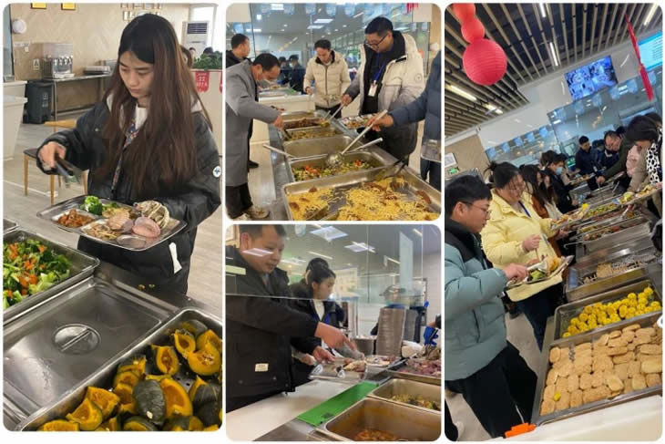 菜名吉利、美味豐盛的各色美食次序排開(kāi)。大家一時(shí)難以抉擇,紛紛表示“我全都要”。餐盤中,海鮮肉食、清爽鮮蔬、精美糕點(diǎn)、甜蜜水果很快摞起一座高高的小山?!靶虏松峡?!”司務(wù)長(zhǎng)一聲吆喝,又引得無(wú)數(shù)圍觀,好不熱鬧。