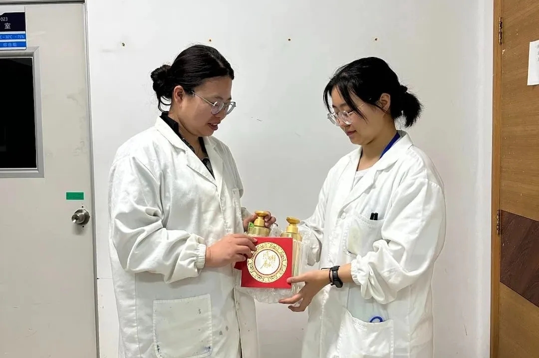 面對每一項任務(wù),她都敢于挑戰(zhàn)、不畏困難。在成品組的檢測項目中,她發(fā)現(xiàn)對照品物質(zhì)在室溫下易融化導(dǎo)致稱稱樣結(jié)果不準(zhǔn)確的問題,經(jīng)過幾次檢測該產(chǎn)品后,她積極思考如何有效控溫并提高稱量速度。經(jīng)過一番思索,她嘗試使用過濾膜塑料盒加水制作簡易“冷凍倉”,在稱量過程中幫助產(chǎn)品有效保溫,保證對照品處于冷凍狀態(tài)。在經(jīng)過多次使用后,發(fā)現(xiàn)該方式對稱量對照品速度有顯著提升,同時減少了對照品使用成本。