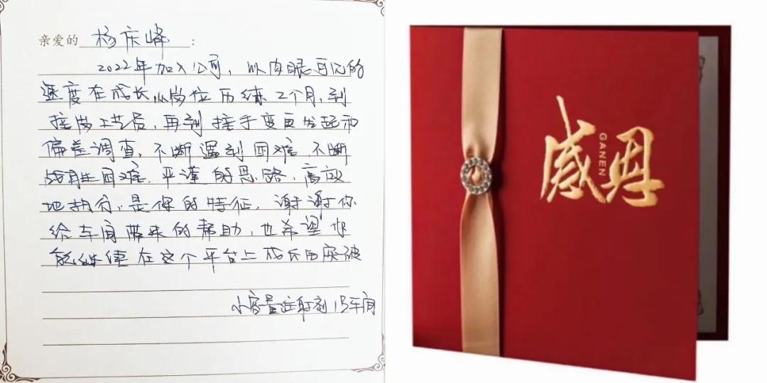 感謝卡:2022年加入公司,以肉眼可見的速度在成長,從崗位歷練2個月,到接崗工藝員,再到接手變更發(fā)起和偏差調(diào)查,不斷遇到困難,不斷戰(zhàn)勝困難。嚴謹?shù)乃悸罚咝У貓?zhí)行,是你的特征,謝謝你給車間帶來的幫助,也希望你能繼續(xù)在這個平臺上成長和突破。