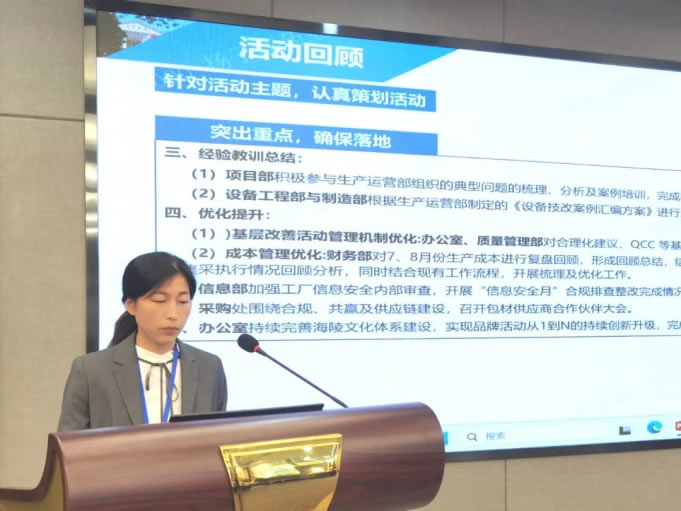 馮部長對第三十六次“質(zhì)量月”活動進行總結(jié)發(fā)言。圍繞本次活動內(nèi)容、不足與改進以及承上啟下內(nèi)容進行展開:1)在總結(jié)中,她通過正反面案例展示活動期間各部門的亮點工作和不足;2)她強調(diào)要強化質(zhì)量月內(nèi)容與標準模板的解讀,保證材料輸出的質(zhì)量;3)最后,她針對質(zhì)量管理部制定的崗位“放心人”選拔方案進行解讀,希望大生產(chǎn)系統(tǒng)各部門能夠選拔更多的放心人,挖掘新生力量,推動企業(yè)不斷成長。