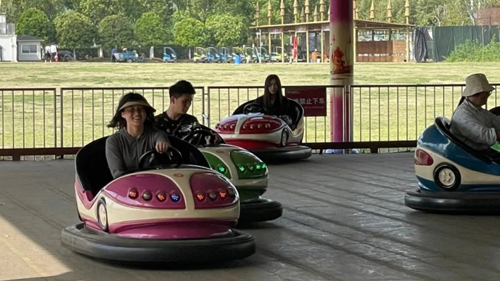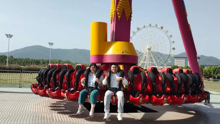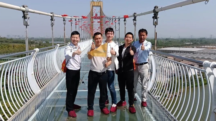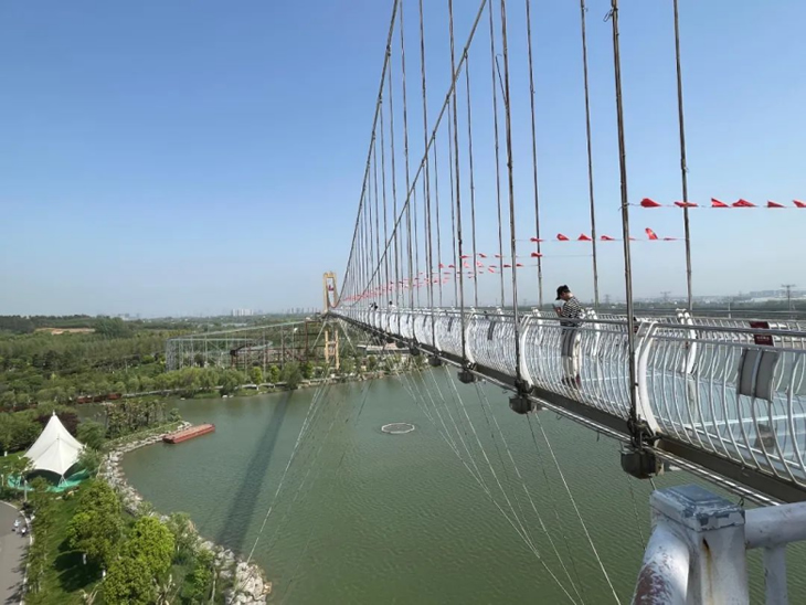 午后升溫的烈日下,完成競賽的成員三五成群的來到游樂設(shè)施區(qū)域。最火爆的項(xiàng)目非“鵲橋”——高空玻璃棧道莫屬。