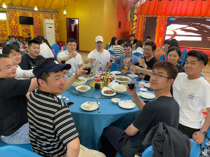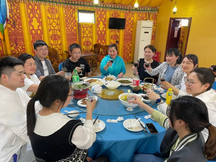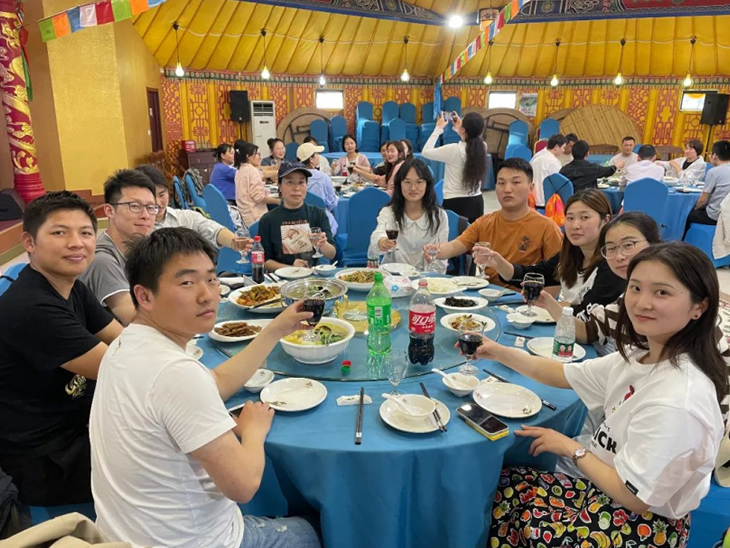 結(jié)束頒獎(jiǎng)后,一行人談笑風(fēng)生地步行前往“蒙古大營”,走進(jìn)用餐區(qū),一個(gè)個(gè)或大或小的蒙古包映入眼簾,落日余暉下的風(fēng)景讓人深感民族特色。大家圍坐在桌旁,享用美味晚餐,幸運(yùn)的我們還觀賞到蒙古族歌曲、舞蹈、和馬頭琴的驚喜表演。