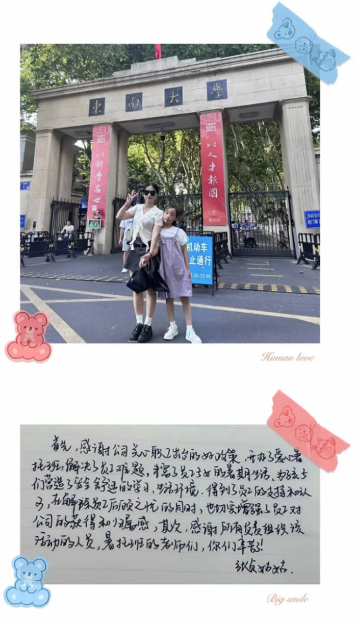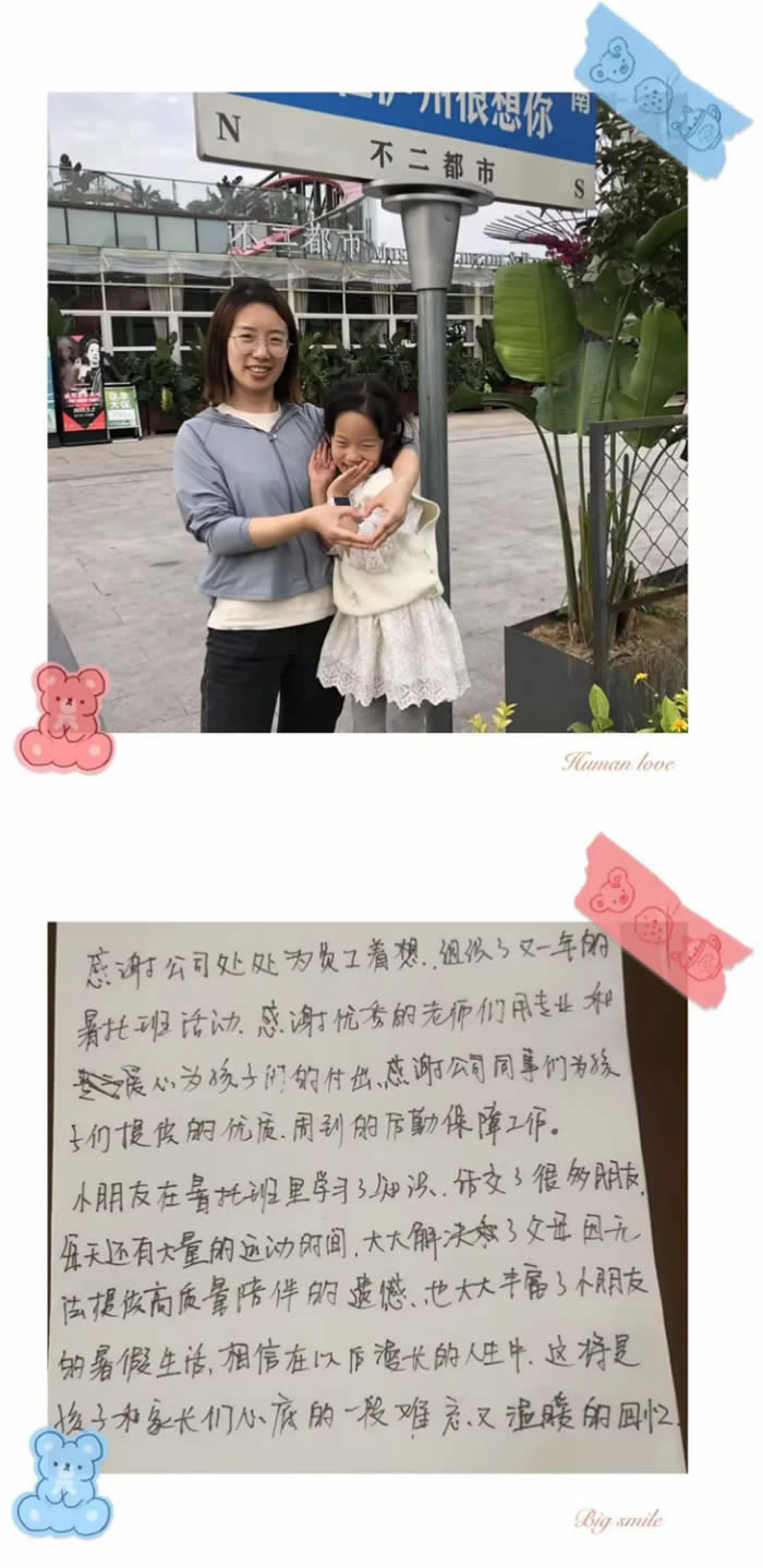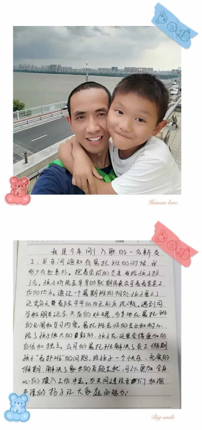 感謝公司為員工解決暑假照顧孩子的困難,這項福利讓身邊的親朋好友羨慕啦!今年孩子肉眼可見的成長了,能做到好好吃飯、好好學(xué)習(xí)、好好玩。不僅認(rèn)識了很多小朋友,還認(rèn)識了很多叔叔阿姨。感謝公司后勤保障部門的付出,也感謝太陽老師和龐老師,你們是最棒的!