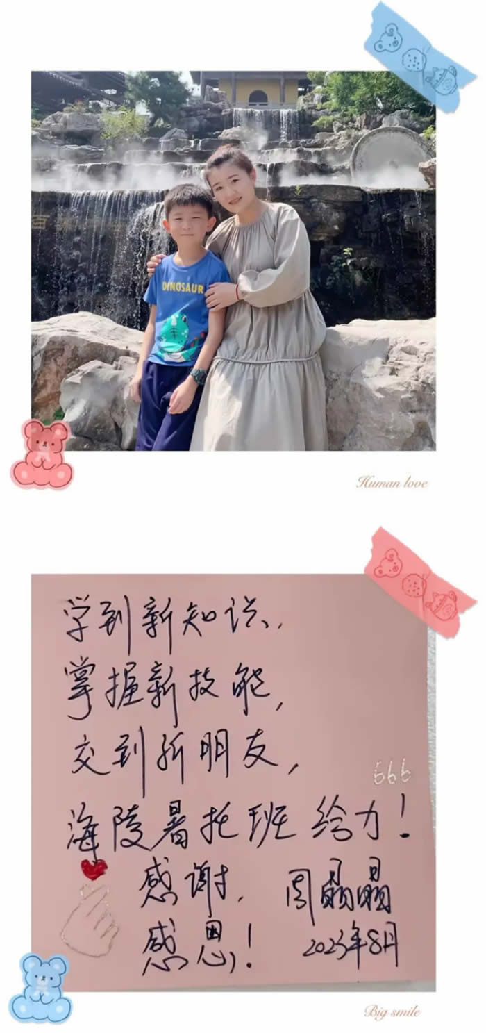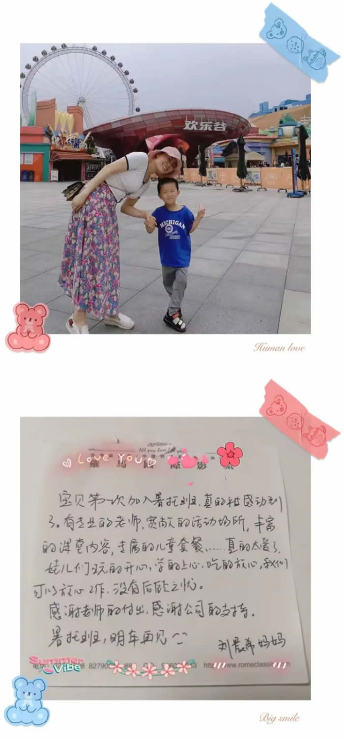 可可小朋友,很開心你又度過了一個愉快的暑假,短暫的一個多月暑托班學(xué)習(xí),你帶來的驚喜、進步、變化非常之多。很感謝公司提供平臺,感謝老師們的辛勤付出,解決家長帶娃問題。明年咱們再見!