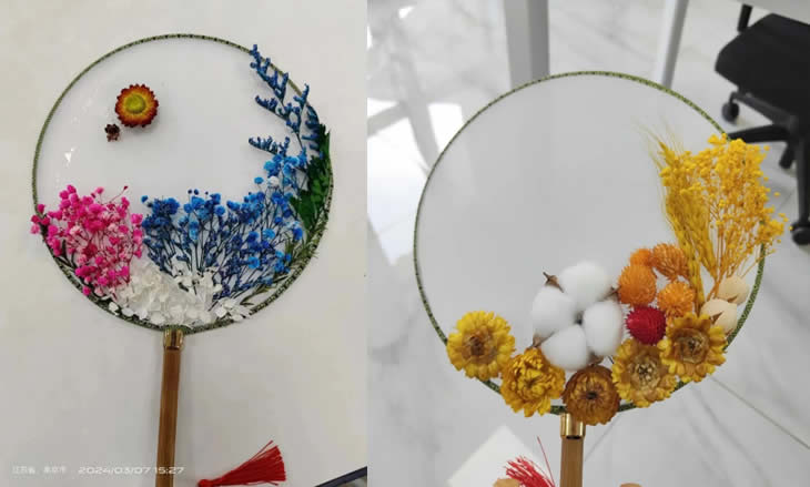 手中白團(tuán)扇。凈如秋團(tuán)月。永生花落座于團(tuán)扇,美在其形,美在其韻,希望“女神”們能與這幅團(tuán)扇一樣美在其心,美在其魂。